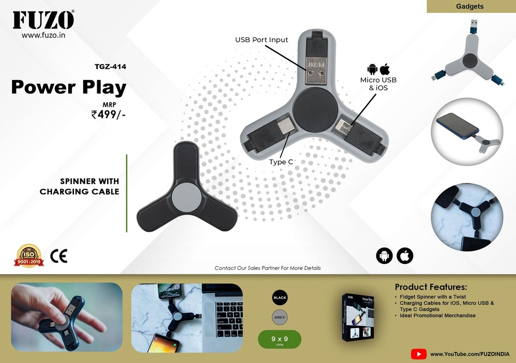 The Fuzo Powerplay Spinner with Charging Cable combines playful stress relief with practical utility. Handheld and branded, it adds enjoyment to your desk while ensuring your devices remain charged. Trend keywords: desk fidget gift, stress relief tool, branded tech gadget, innovative corporate swag.